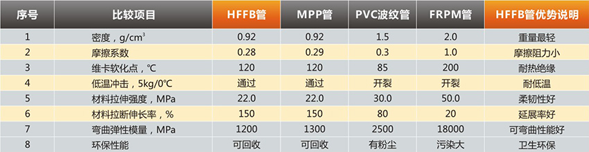 MPP單壁波紋管 (HFFB電力管) 與其他管材的主要性能比較
